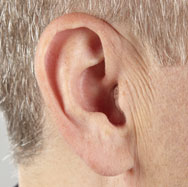 Only the tiny removal handle of the hearing aid shows outside of the ear canal.